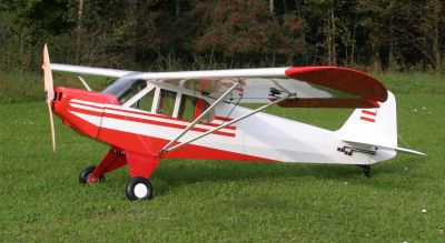 25.09.09 Eingeflogen! Mit gebrauchten LiPos (Zustand gut) 12S 10.000mAh. Also 42V / 130A (5 kW) (gerechnet hatte ich 125A) unter Last an einer 28x10 mit konservativem Timing. Damit steigt die Piper allein schon sehr gut - fast senkrecht. Dies entspricht der vorgesehenen Original-Motorisierung mit einem ZG 80 mit 7 PS. Zweiter Flug dann mit einer 30x10 und ein Timing für ca 200A. Das sind jetzt also ca. 8kW und 24 kg (gerechnet 26 kg) Standschub. Boh!