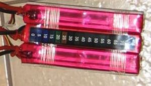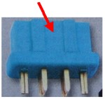 Die neuen MPX-Stecker rechts - gemeint sind eigentlich die akkuseitigen Buchsen, die an der geänderten Nase zu erkennen sind (Pfeil) - schaffen die 60 A Dauerlast jetzt problemlos. Die Vergleichsversuche fanden unter identischen Bedingungen im Twinjet mit 3S4000 H5 statt.