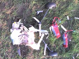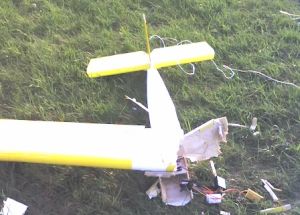14.04.09: Nach drei schönen Schlepps von Wolfgangs 4m Segler hat er im Sinkflug in gut 100m Höhe eine Fläche abgeworfen. Jeglicher Versuch, den jetzt abstürzenden Rest durch Ruder-Vollausschläge zu bremsen, ist gescheitert. Der Motor war bis zur Montageplatte im Boden. Akkus faltig, wie ein Akkordeon (3 x 3S 3200 H5 - au!!!)